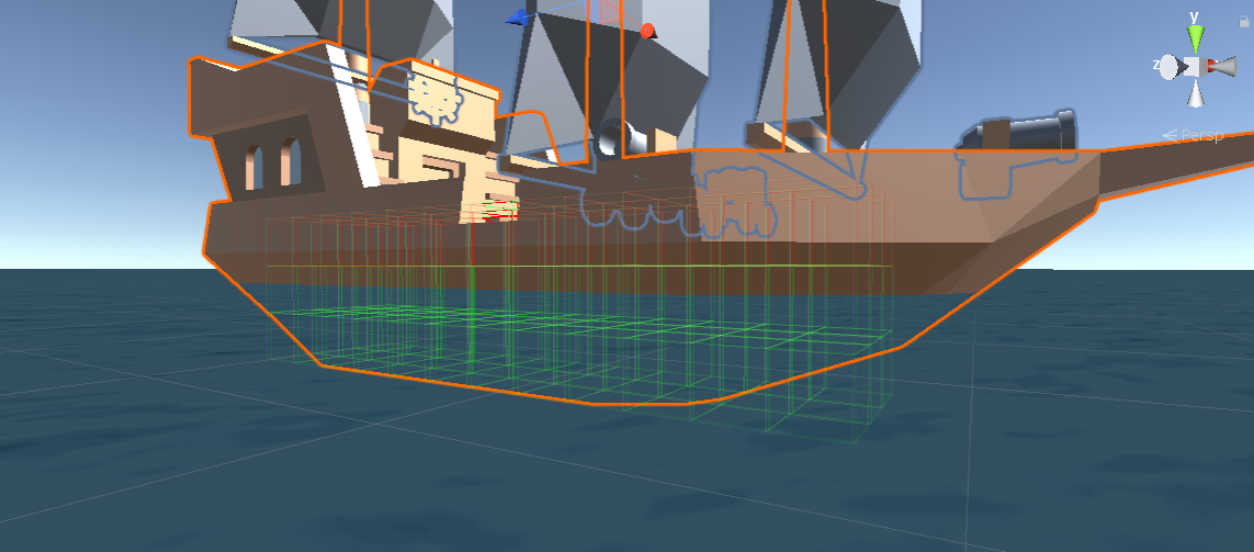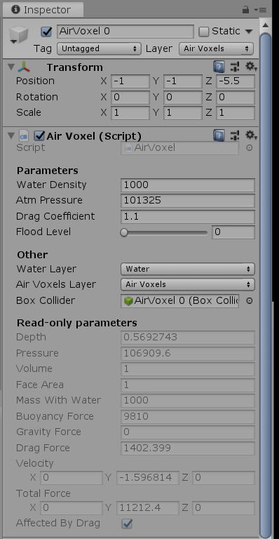 The prototype of the real ship physics in Unity based on the voxel system. Each ship contains a number of air areas, where every one of them generates a set of voxels. They calculate buoyancy, drag and gravity force (if flood level is greater than zero) and then this force is applied to the ship's rigid body.
