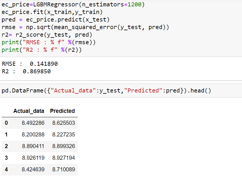 ec_price=LGBMRegressor(n_estimators=1200) ec_price.fit(x_train,y_train) pred = ec_price.predict(x_test) rmse = np.sqrt(mean_squared_error(y_test, pred)) r2= r2_score(y_test, pred) print("RMSE : % f" %(rmse)) print("R2 : % f" %(r2))