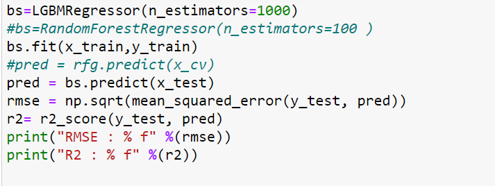 bs=LGBMRegressor(n_estimators=1000) #bs=RandomForestRegressor(n_estimators=100 ) bs.fit(x_train,y_train) #pred = rfg.predict(x_cv) pred = bs.predict(x_test) rmse = np.sqrt(mean_squared_error(y_test, pred)) r2= r2_score(y_test, pred) print("RMSE : % f" %(rmse)) print("R2 : % f" %(r2))