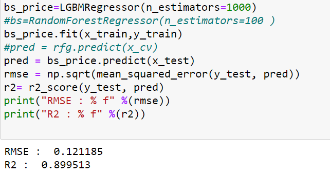 bs_price=LGBMRegressor(n_estimators=1000) #bs=RandomForestRegressor(n_estimators=100 ) bs_price.fit(x_train,y_train) #pred = rfg.predict(x_cv) pred = bs_price.predict(x_test) rmse = np.sqrt(mean_squared_error(y_test, pred)) r2= r2_score(y_test, pred) print("RMSE : % f" %(rmse)) print("R2 : % f" %(r2))