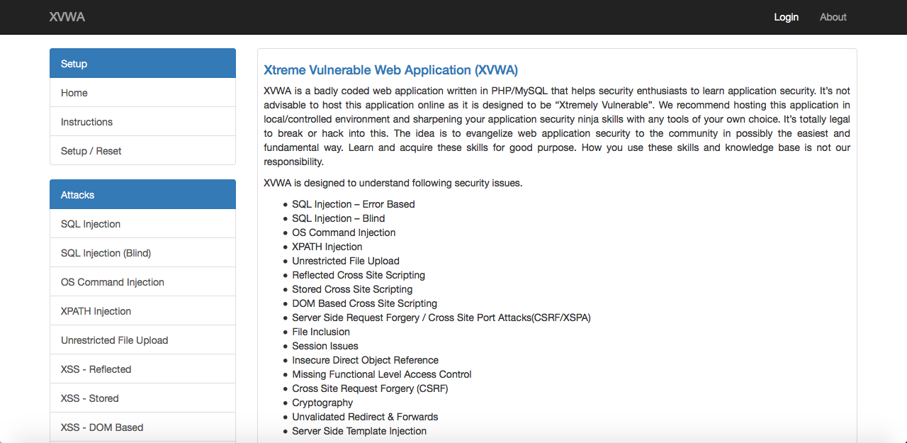 XVWA is intentionally designed with many security flaws and enough technical ground to upskill application security knowledge. This whole idea is to evangelize web application security issues. Do let us know your suggestions for improvement or any more vulnerability you would like to see in XVWA future releases.